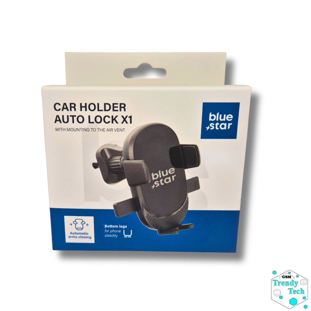 A Blue star Auto lock X1 telefontartó egy könnyen kezelhető kiegészítő. Minden mobiltelefon típushoz megfelelő, szellőző nyílásba rögzíthető autós tartó. Az alsó karokkal nyissa szét a felső karokat, majd helyezze a telefont a tartóba. A készüléket óvatosan nyomja meg lefelé, így a felső karok automatikusan rázáródnak a telefonra és stabilan tartják azt.