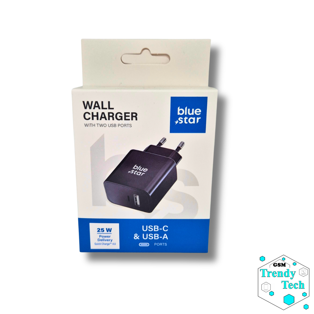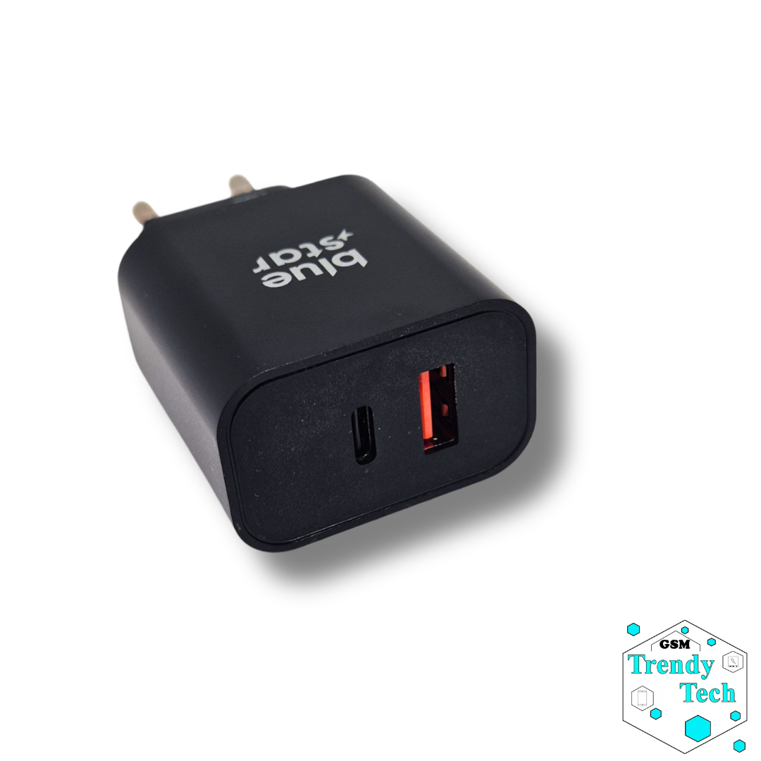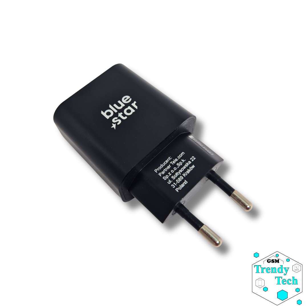 A Blue star hálózati adapter gyors töltés funkcióval PD, QC 4.0, AFC és USB-C és USB-A csatlakozókkal rendelkezik a modern okoskészülékekhez, akár 25W teljesítményig.