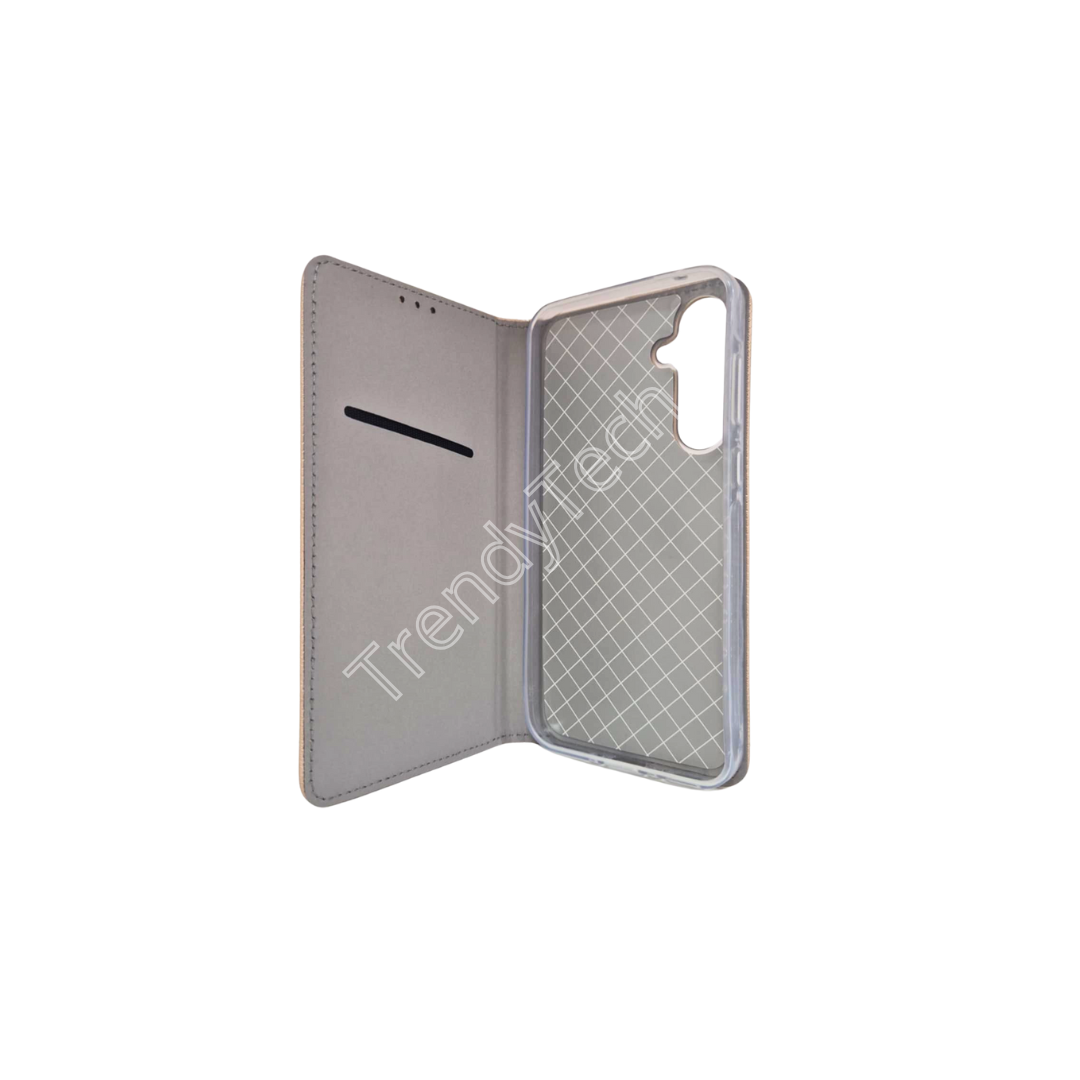 Műbőr oldalra nyíló tok. Mágnesesen záródó. Egy bankkártya tartó zsebbel.