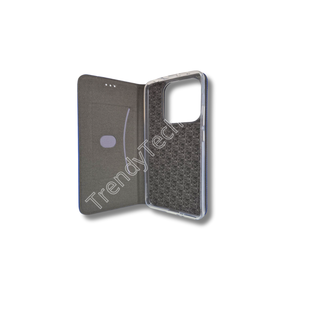 Szövet és műbőr textúrájú oldalra nyíló tok. Mágnesesen záródó. Egy bankkártya tartó zsebbel.